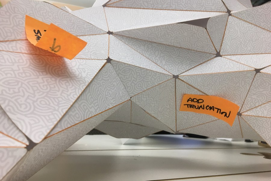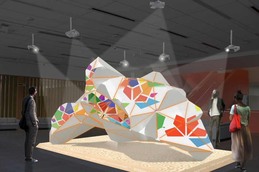 Work in Progress is a response to this question proposed for the second-floor Creativity Commons in Hazel McCallion Campus B-Wing. Led by faculty members Douglas Donald and Claire Ironside, students, faculty and staff from across Sheridan’s campuses worked together to develop and test the concept. The proposed sculpture is made from interconnected acrylic polygons (their number correlating to Sheridan’s programs, degrees, diplomas and certificates) etched with the Sheridan brand. Using projection mapping technology, the sculpture’s surface is illuminated by a dynamic data bank of images that provide insight into creative processes throughout the College. Interdisciplinary team members plan to design, render, fabricate and install Work in Progress using Sheridan community resources.