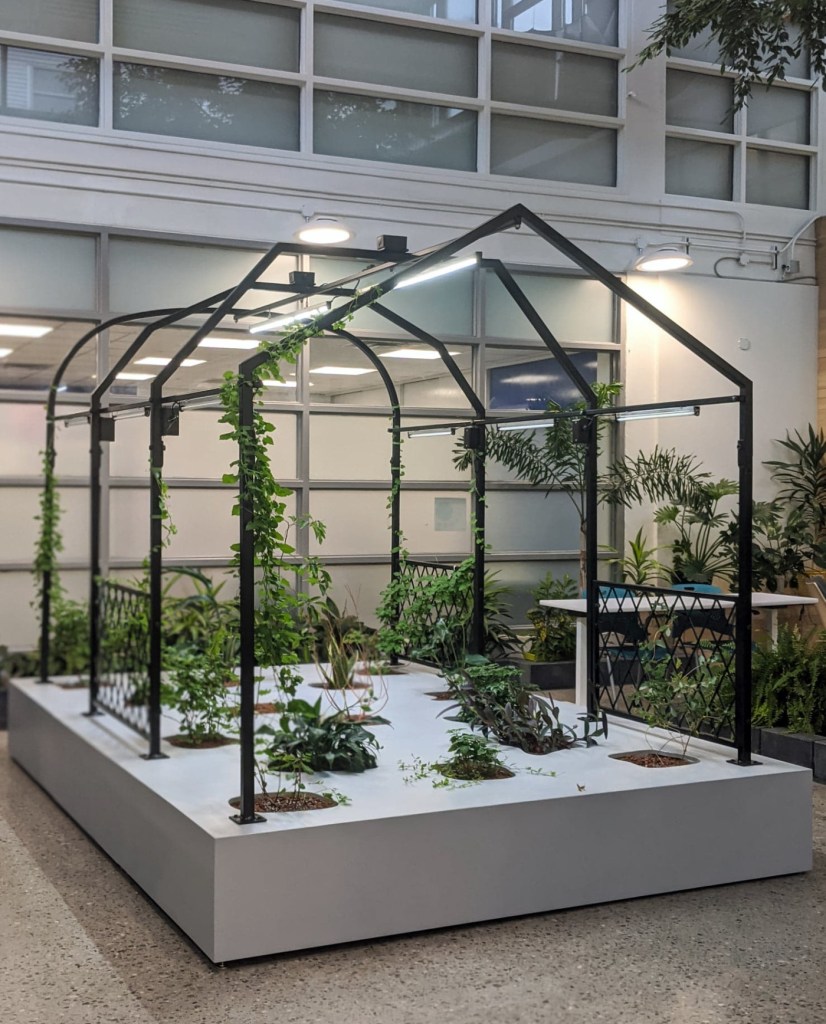 The greenhouse-like structure is composed of a CNC-cut plywood base, beneath a welded steel shell that houses over a dozen plants, of which several climb onto lattice supports. Programmed irrigation and light systems elicit subtle plant movement over time.